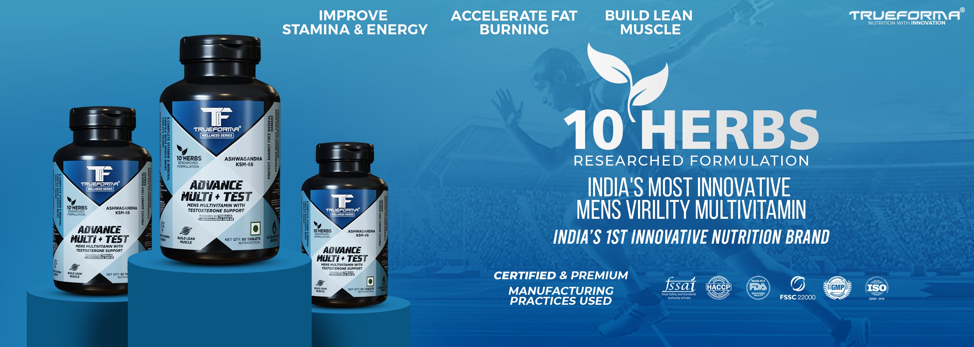 Trueforma® Advance Multi + Test is a comprehensive blend of vitamins, minerals, digestive enzymes, and men's virility herbs. It supports overall health, energy, immunity, and male vitality, formulated with clinically researched ingredients like Tribulus, Ashwagandha KSM-66, and a proprietary blend of 10 powerful herbs.