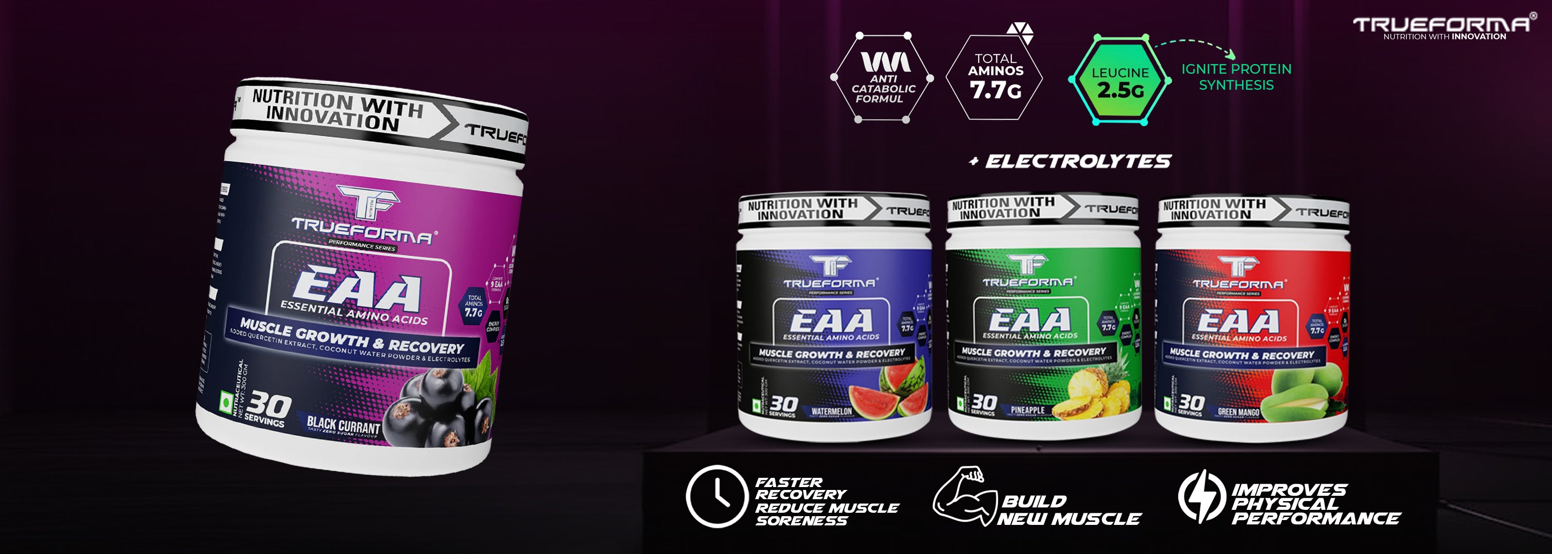 Trueforma® EAA provides the building blocks needed for muscle repair and growth. With 7.7 grams of total amino acids per serving, including 3.5 grams of BCAAs, it kickstarts the process of muscle protein synthesis and helps you build new muscles effectively.